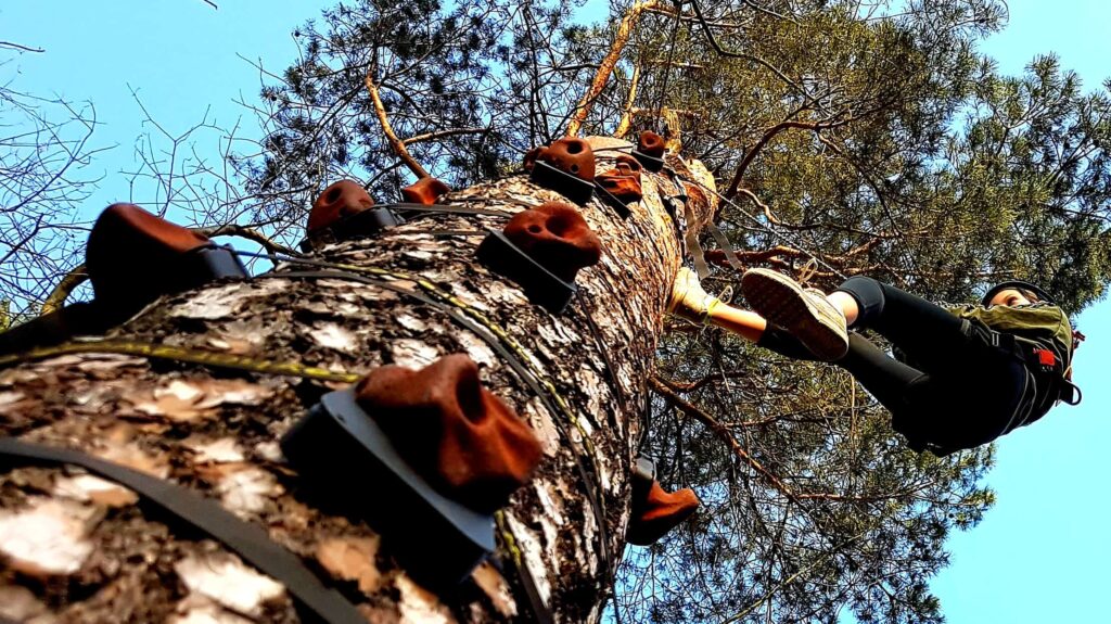 Flexibel in der Höhe, entsprechend der Zielgruppe anpassbar, befestigen wir Klettergriffe an einem Baum, ohne diesen zu beschädigen.
