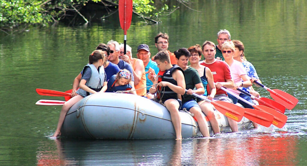 Tourpaket: Schlauchboot, Stechpaddel, Schwimmwesten, Getränketaschen, Behälter für Wertgegenstände, Einweisung, Rücktransfer von max. 7 PKW Fahrer